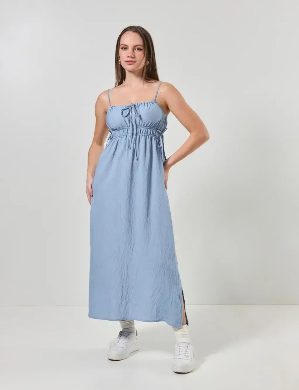 Cette robe d'exception capture l'essence des matins d'été français dans sa teinte bleu ciel délicate. Sa couleur évoque la sérénité des ciels provençaux, apportant une fraîcheur chromatique qui illumine naturellement le teint et révèle une féminité rayonnante.