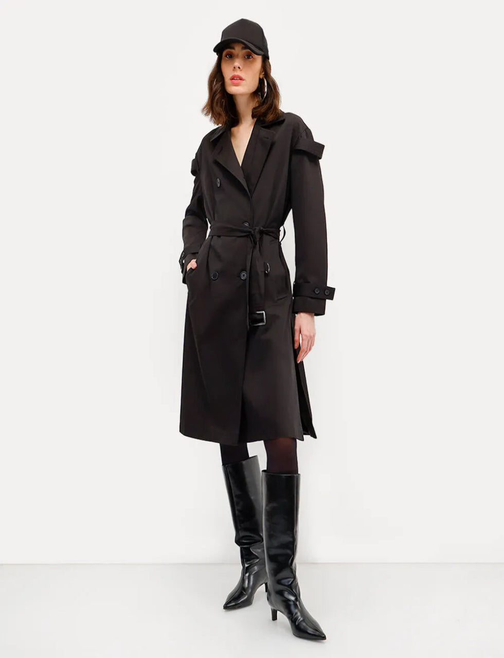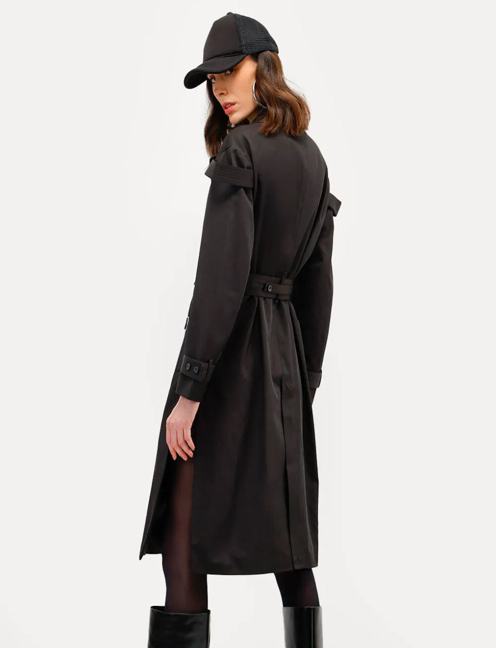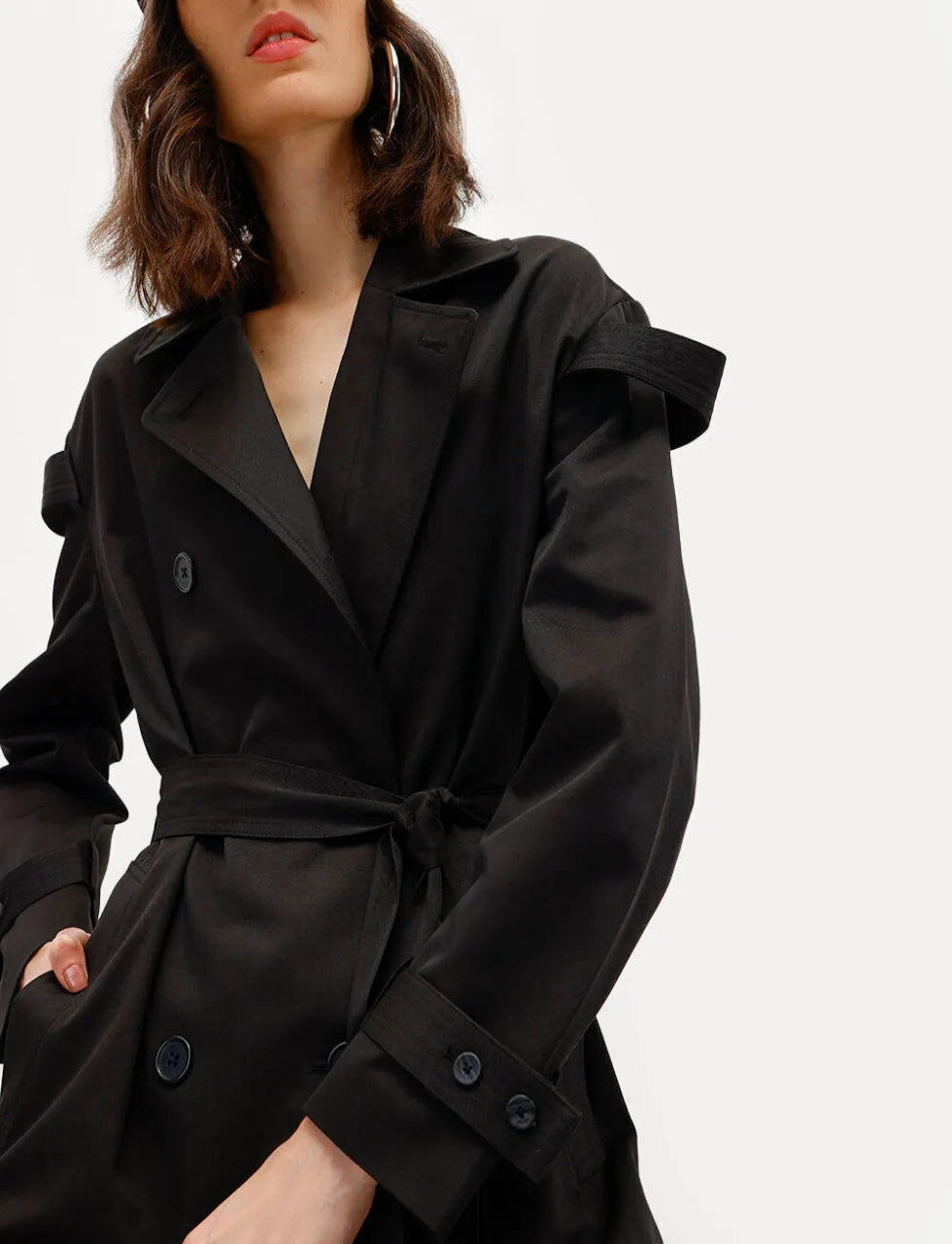 Ce trench-coat noir transforme l'iconique silhouette britannique en pièce statement contemporaine. Sa teinte profonde et sa coupe déstructurée créent une allure mystérieuse et sophistiquée, parfaite pour la femme moderne qui affirme son style.